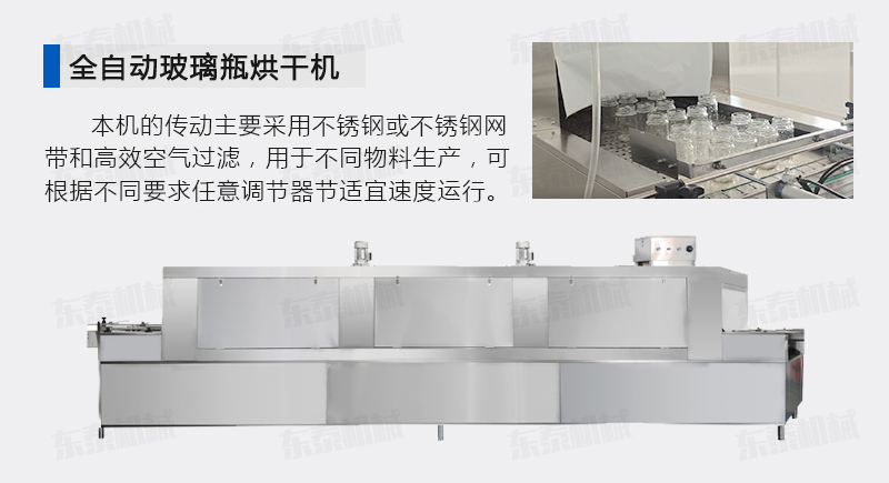 本機適用玻璃瓶及其它玻璃容器的干燥滅菌,食品等行業(yè)烘烤之用。 本機的傳動主要采用不銹鋼或不銹鋼網(wǎng)帶和空氣過濾,用于不同物料生產(chǎn),可根據(jù)不同要求任意調(diào)節(jié)器節(jié)適宜速度運行。本機電熱元件選項用乳白色石英玻璃管為加熱元件,具有系數(shù)高、能耗低、升溫區(qū)、降溫區(qū)、冷卻區(qū)等區(qū)域,溫度范圍有50-300℃本機除機架外,全部采用不銹鋼材料制作,保溫材料采用硅酸鋁纖維,保溫性能好等優(yōu)點,是制藥-食品-日化等行業(yè)的選擇。