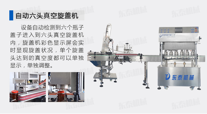 該直線式真空旋蓋機是東泰機械結(jié)合用戶使用的情況,摒棄了傳統(tǒng)轉(zhuǎn)盤式真空旋蓋機的弊端,研制開發(fā)的設(shè)備,設(shè)備自動檢測到六個瓶子蓋子進入到六頭真空旋蓋機內(nèi),旋蓋機彩色顯示屏會實時顯現(xiàn)旋蓋狀況,整機多點檢測,當進口無瓶無蓋、出口堵塞、定位不準、瓶身傾倒均自動停機。單個旋蓋頭達到的真空度都可以單獨顯示,單獨調(diào)整!