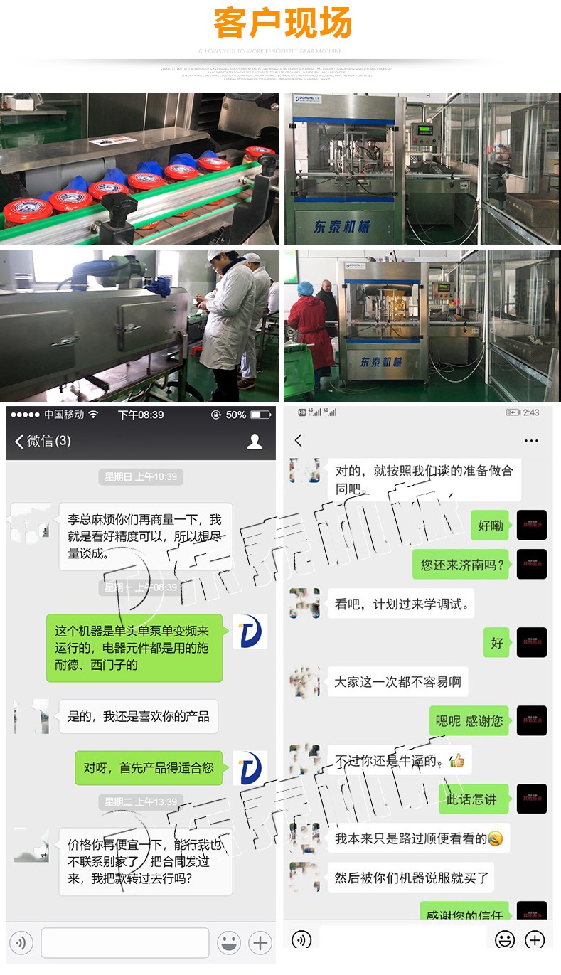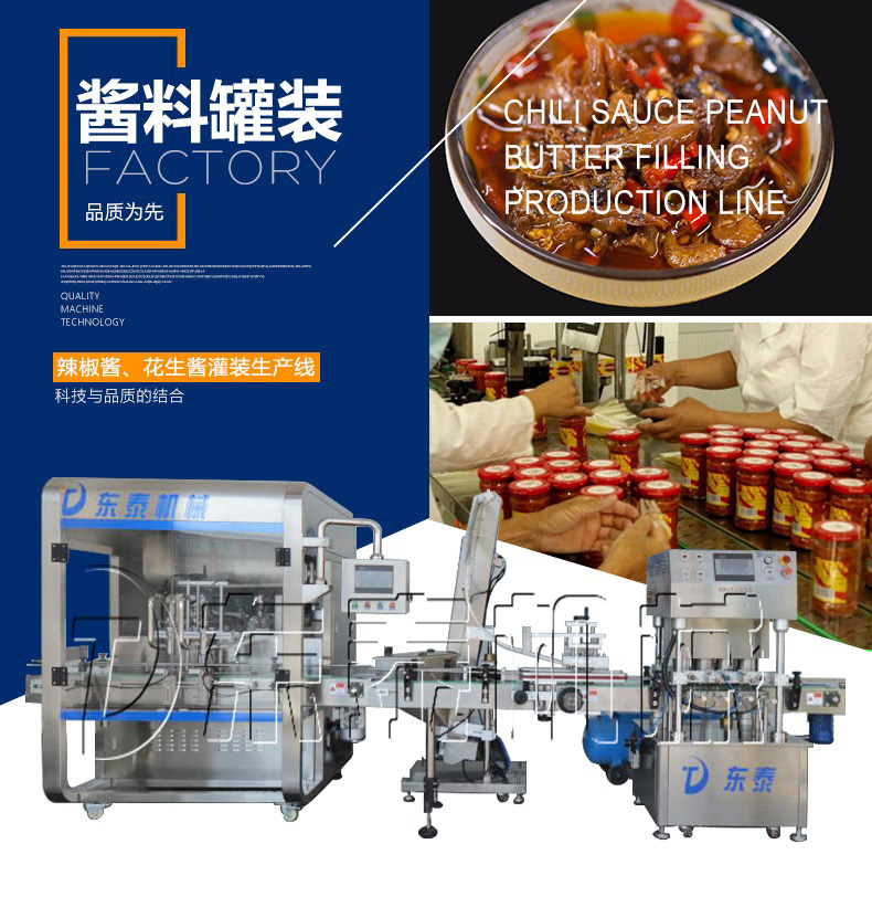 該生產(chǎn)線適合中小口徑三旋、四旋玻璃瓶調(diào)味醬的分裝,適合醬料、含顆粒黏稠物料的灌裝,物料接觸部分均采用316不銹鋼,整機304不銹鋼,符合食品衛(wèi)生標準。該機設計合理,機型小巧,立式結(jié)構,節(jié)省場地,操作方便。啟動部分均采用德國FESTO和臺灣AirTack的氣動元件。灌裝閥有氣動閥控制,灌裝精度更高,灌裝量和灌裝速度均可任意調(diào)整,灌裝悶頭采用防拉絲及升降灌裝裝置。