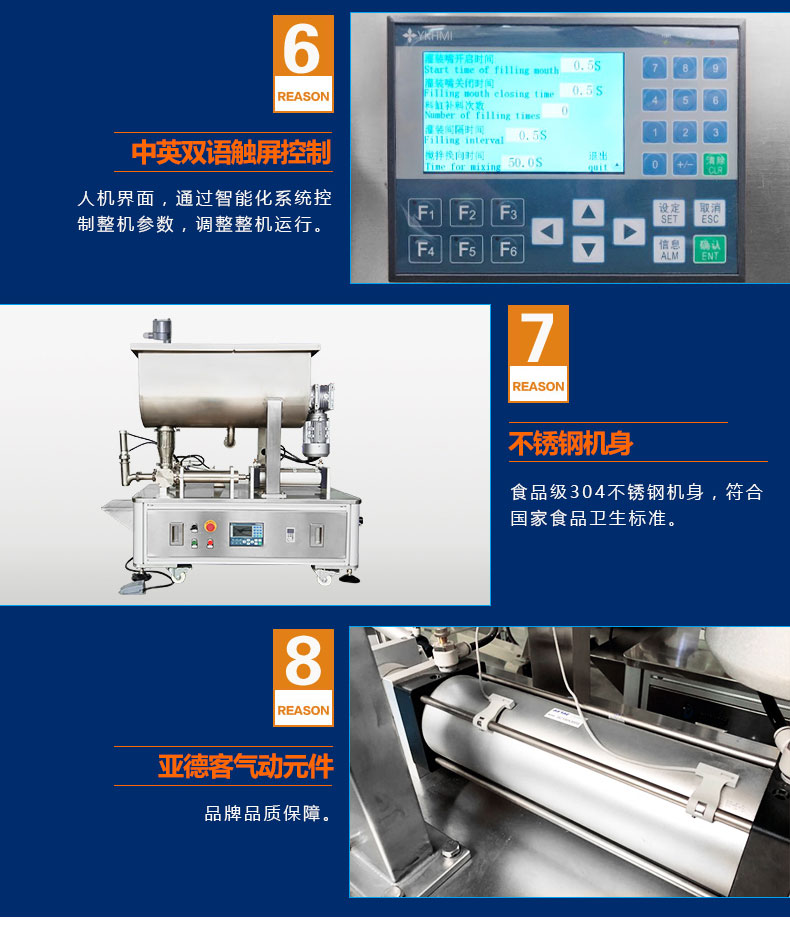 產(chǎn)品簡介:半自動醬類醬料灌裝機(jī)SFM系列結(jié)構(gòu)合理、機(jī)型小巧、性能可靠、定量準(zhǔn)確、操作方便。整機(jī)304不銹鋼,灌裝悶頭防漏料防滴油,氣缸驅(qū)動結(jié)構(gòu),加大200L料斗,品牌全鋁殼銅芯大功率攪拌電機(jī),變頻調(diào)速,PLC智能控制,用戶可根據(jù)需要任意調(diào)節(jié)灌裝量及灌裝速度,灌裝精度高。