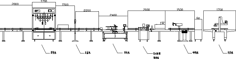 | 方案設(shè)計一:灌裝機+壓蓋機+貼標(biāo)機+自動膠帽熱縮機+噴碼機+封箱機 |