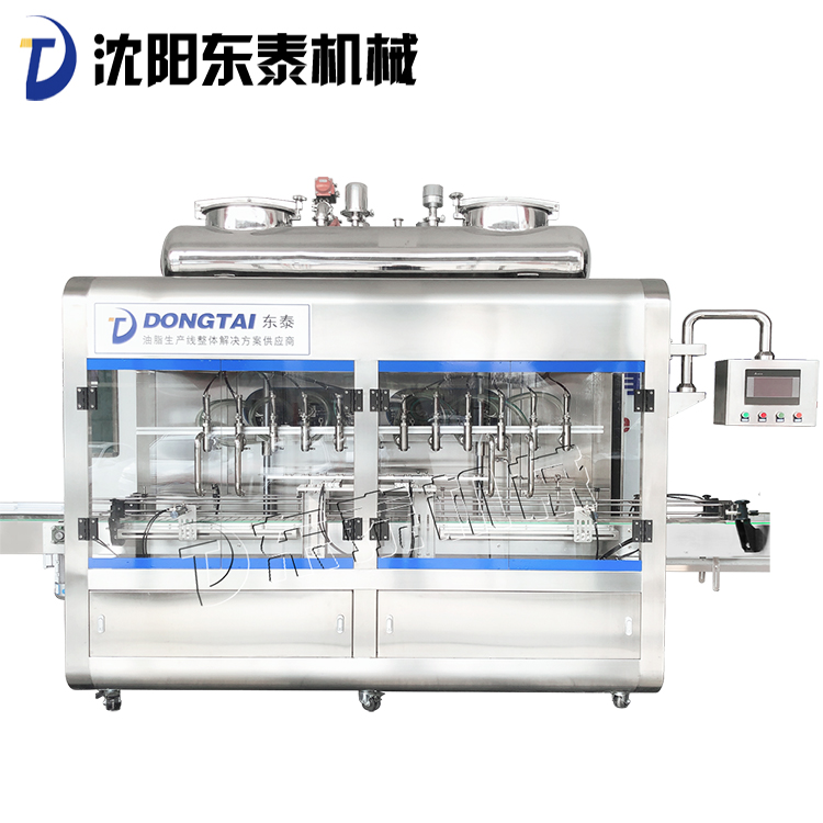 3、 該設備在設計上大大縮短了下料斗到灌裝頭的灌裝距離,克服了含油量大的物料(如:含芝麻粒的辣椒油)在灌裝過程中出現(xiàn)的有些瓶油多,有些瓶醬多的灌裝誤差大的缺點。